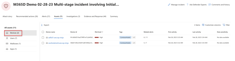 The Devices view lists all the devices related to the incident. Here's an example.