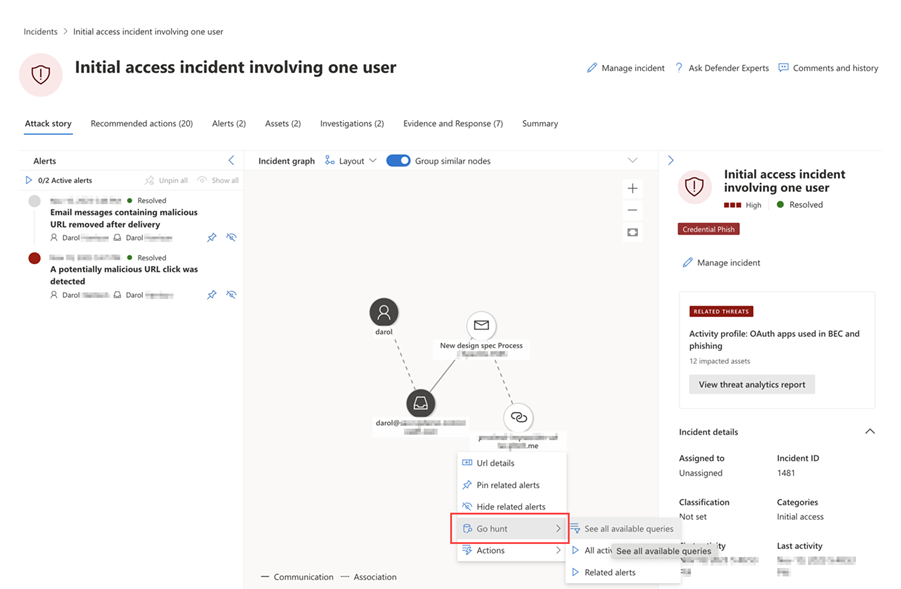 The investigation graph helps you quickly grasp the full extent of the attack by showing the different entities that are suspicious and how they are connected to their associated assets such as users, devices, and mailboxes.
